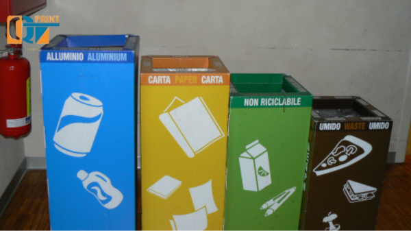 Viết chữ “THÙNG RÁC TÁI CHẾ” hoặc “RÁC KHÔ/RÁC ƯỚT”.
